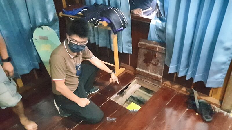 จากการตรวจสอบพบว่าในห้องพักมีการดัดแปลงพื้นห้องทำเป็นช่องลับที่สามารถเปิดออก เพื่อลงไปใต้แพได้ บริเวณใต้แพยังทำช่องลับซ่อนกล่องกระดาษใบใหญ่ ภายในซุกซ่อนยาบ้าที่บรรจุในถุงพลาสติกใส รวม 11 ห่อ หรือประมาณ 1,100 เม็ด