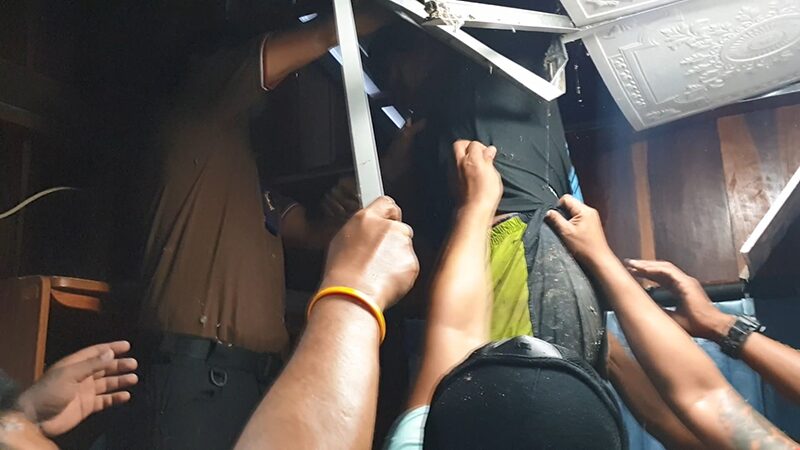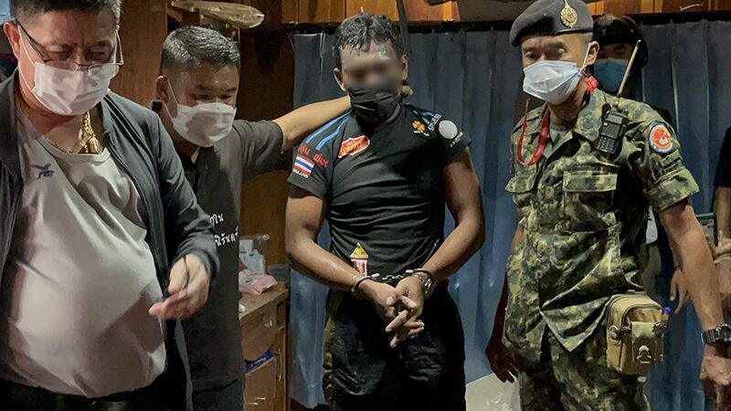ทั้งนี้ ในระหว่างที่เจ้าหน้าที่กำลังตรวจค้นอยู่บนแพ ได้ยินเสียงดังมาจากบริเวณด้านบนฝ้าเพดาน เจ้าหน้าที่จึงรีบกระจายกำลังกันออกปิดล้อม พร้อมใช้ไม้กระทุ้งฝ้าเพดาน คาดว่าเป็นผู้ต้องหาอีกรายที่ฉวยโอกาสกระโดดน้ำหลบหนีไป น่าจะซ่อนตัวอยู่บนฝ้าเพดาน โดยใช้เวลาอยู่ประมาณ 5 นาที จึงสามารถจับกุมตัวผู้ต้องหาไว้ได้ ซึ่งเป็นคนเดียวกับที่กระโดดน้ำหนี พบสภาพตัวยังคงเปียกชุ่ม