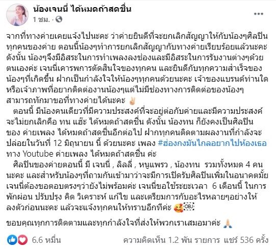 จากที่ทางค่ายเคยแจ้งไปนะคะ ว่าค่ายยินดีที่จะยกเลิกสัญญาให้กับน้องๆศิลปินทุกคนของค่าย ตอนนี้น้องๆทำการยกเลิกสัญญากับทางค่ายเรียบร้อยแล้วนะคะ ดังนั้น น้องๆจึงมีอิสระในการทำเพลงลงช่องและมีอิสระในการรับงานต่างๆด้วยตนเองค่ะ เจนนี่เคารพการตัดสินใจของทุกคน และยินดีกับทุกความสำเร็จของน้องๆที่เกิดขึ้น ฝากเป็นกำลังใจให้น้องๆทุกคนด้วยนะคะ เจ้าของแบรนด์ท่านใดหรือเจ้าภาพที่อยากติดต่องานน้องๆแต่ไม่มีช่องทางการติดต่อของน้องๆ สามารถทักมาขอที่ทางค่ายได้นะคะ
